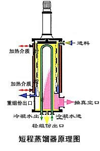在沸騰的薄膜和冷凝面之間的壓差是蒸汽流向的驅(qū)動力,對于微小的壓力降就會引起蒸汽的流動。在1mbar下運行要求在沸騰面和冷凝面之間短的距離,基于這個原理制作的蒸餾設(shè)備稱為短程分子蒸餾設(shè)備。短程分子蒸餾設(shè)備(分子蒸餾)有一個內(nèi)置冷凝器在加熱面的對面,并使操作壓力降到0.001mbar。