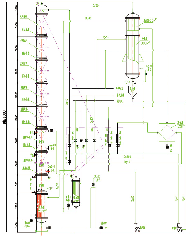 本裝置適用于制藥、食品、輕工、化工等行業(yè)的稀酒精回收。也適用于甲醇等其他溶煤的蒸餾。本裝置根據用戶的需要,可根據30℃左右的稀酒精蒸餾至90℃-95℃酒精,成品酒精度數(shù)要求再高,可以加大回流比,但產量就相應減少。